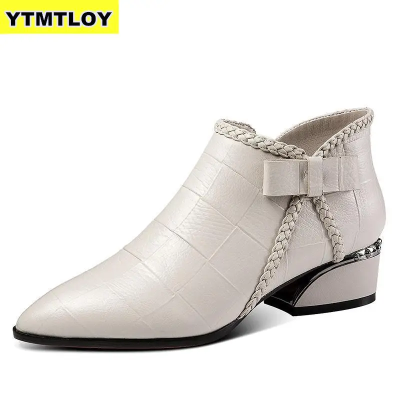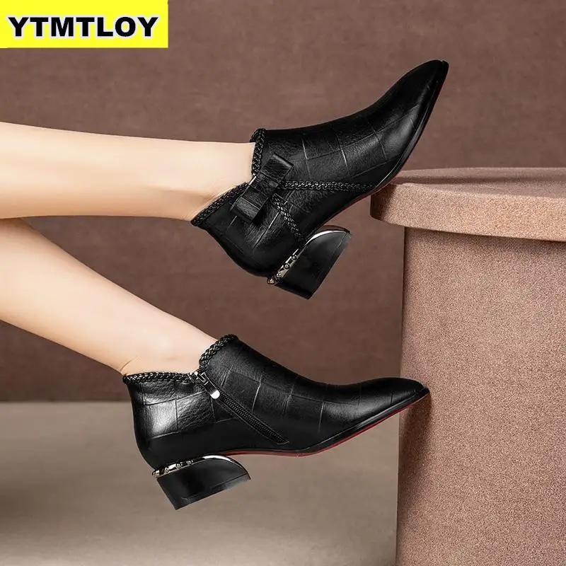 2019 Fashion Women Boots Casual Leather Low High Heels Spring Shoes Woman Pointed Toe Rubber Ankle Boots Black Red Zapatos Mujer